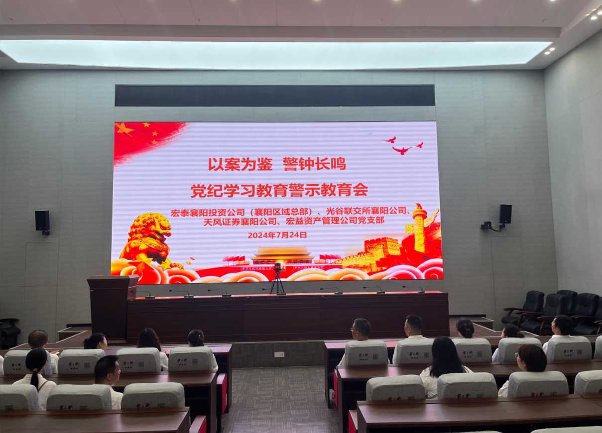 为扎实抓好党纪学习教育,贯彻落实集团2024年上半年经营工作会议精神,7月24日上午,宏泰襄阳投资公司(襄阳区域总部)党支部发挥党建联系纽带作用,联合天风证券襄阳分公司、宏益资产管理公司、光谷联交所襄阳公司等集团在襄单位党支部开展“铭纪于心”主题党日活动,组织党员干部20余人前往襄阳市反腐倡廉教育中心,参观廉政教育展厅,观看警示教育片,接受警示教育。