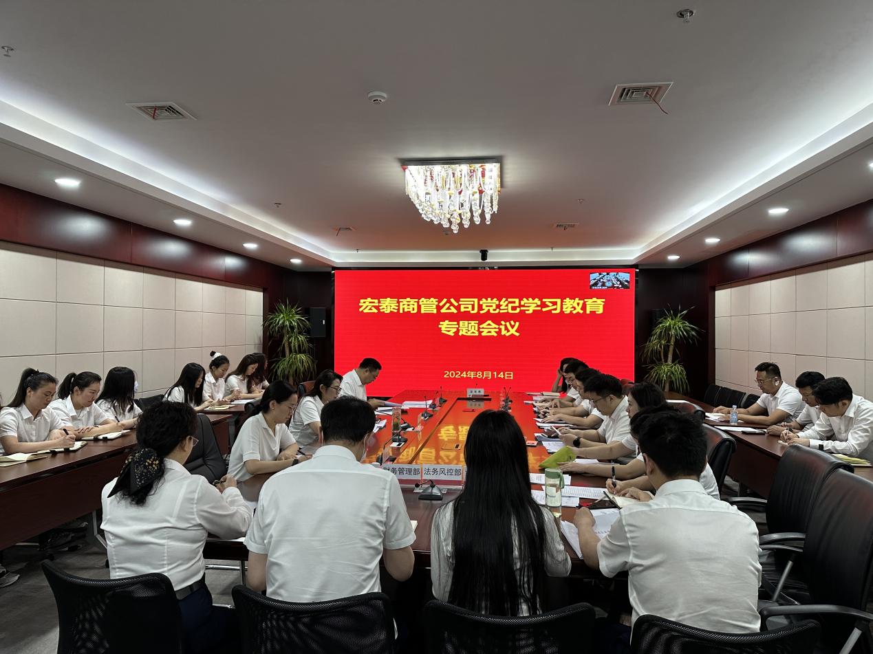 2024年8月14日,宏泰商管公司在宏泰大厦9楼会议室召开党纪学习教育专题会,认真学习了习近平总书记关于善始善终抓好党纪学习教育重要讲话精神,进一步落实省委党纪学习教育工作专班和集团党委相关要求,从严从实抓好典型案例剖析、违纪风险点排查、工作作风突出问题专项整治等工作,确保高质量完成党纪学习教育各项任务。公司党总支书记、执行董事、总经理郭春桢主持会议并讲话,党总支委员、副总经理刘建兵出席会议。