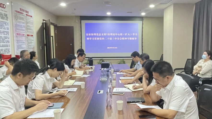 9月13日,宏泰保理开展第7次理论中心组专题学习暨学习贯彻党的二十届三中全会精神专题辅导,武汉大学政治与公共管理学院教授、博士生导师、学习贯彻党的二十届三中全会精神武汉大学宣讲团成员吕普生教授受邀作专题辅导。公司党总支委员、纪检委员文俊主持会议,公司党总支委员、领导班子成员、全体党员职工和供应链科技公司全体职工参加会议。