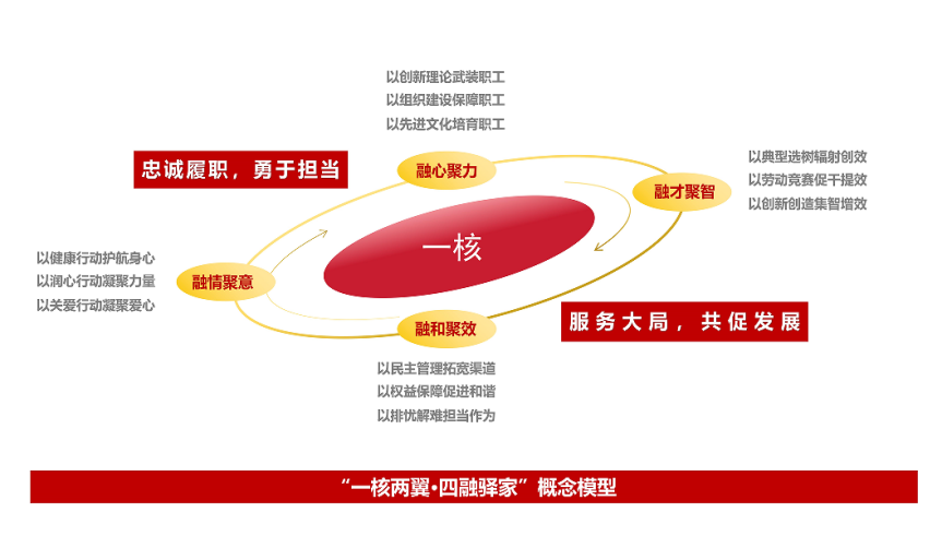 “一核两翼·四融驿家”工作体系以“一核”为轴心、以“两翼”为理念、以“四融”为抓手形成驱动,共同发力,倾力打造“一家亲”幸福和谐企业。一核:以“坚持党的领导”为核心,确保工会工作正确政治方向;两翼:即深植“忠诚履职,勇于担当”和“服务大局,共促发展”的工作理念,使工会工作助力企业高质量发展。四融:以“融心聚力、融才聚智、融和聚效、融情聚意”四大工程为聚合点,激发全体职工引领力、驱动力、凝聚力与向心力。驿家:不仅象征着工会与职工“一家亲”的和谐关系,还寓意着“e+”时代的到来,打造一个数字化、智能化的职工服务平台,让职工享受更加便捷、高效、贴心的服务。