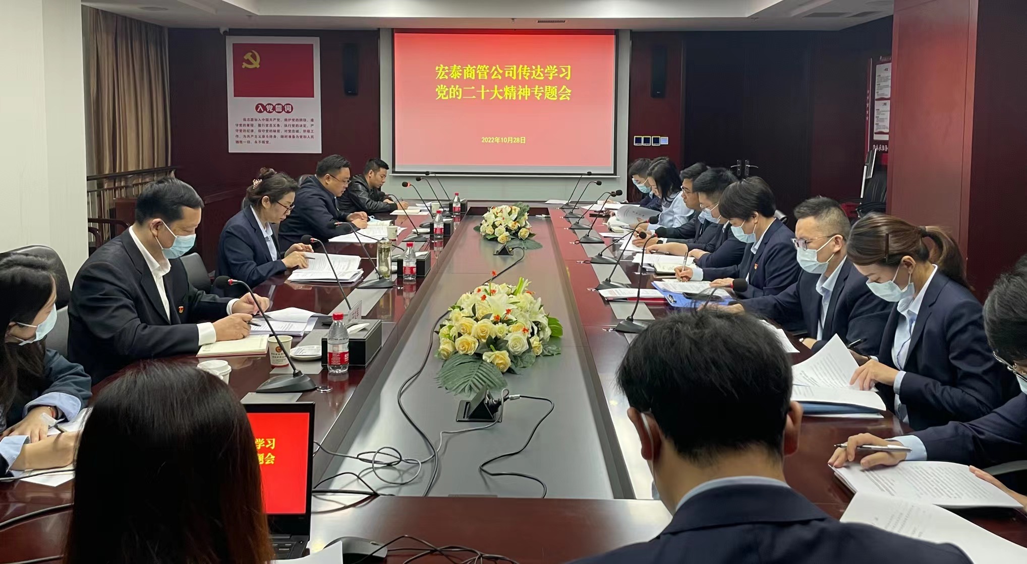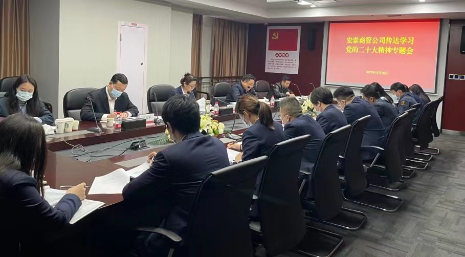 10月28日,宏泰商管党总支召开传达学习党的二十大精神专题会,公司党总支副书记、执行董事、总经理郭春桢主持会议并讲话,公司党总支委员、副总经理刘建兵出席会议并传达学习了党的二十大精神和“集团传达学习党的二十大精神会议内容”。