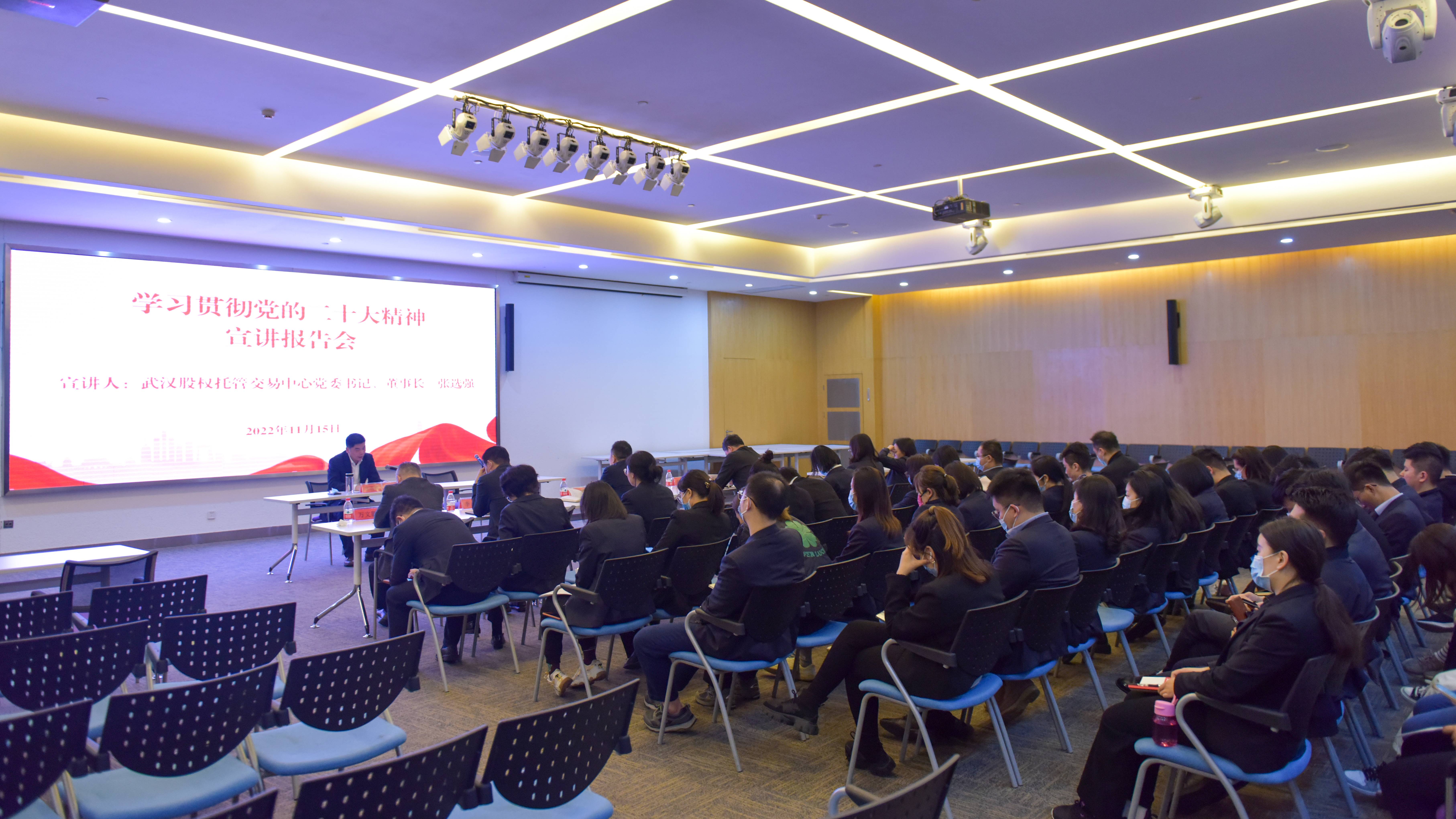11月15日下午,武汉股权托管交易中心举办学习贯彻党的二十大精神宣讲报告会,武交中心党委书记、董事长张选强以《深入学习宣传贯彻党的二十大精神 为宏泰集团打造省级一流金控平台、服务全省实体经济贡献区域性股权市场力量》为题,为中心全体党员干部职工作专题宣讲报告。