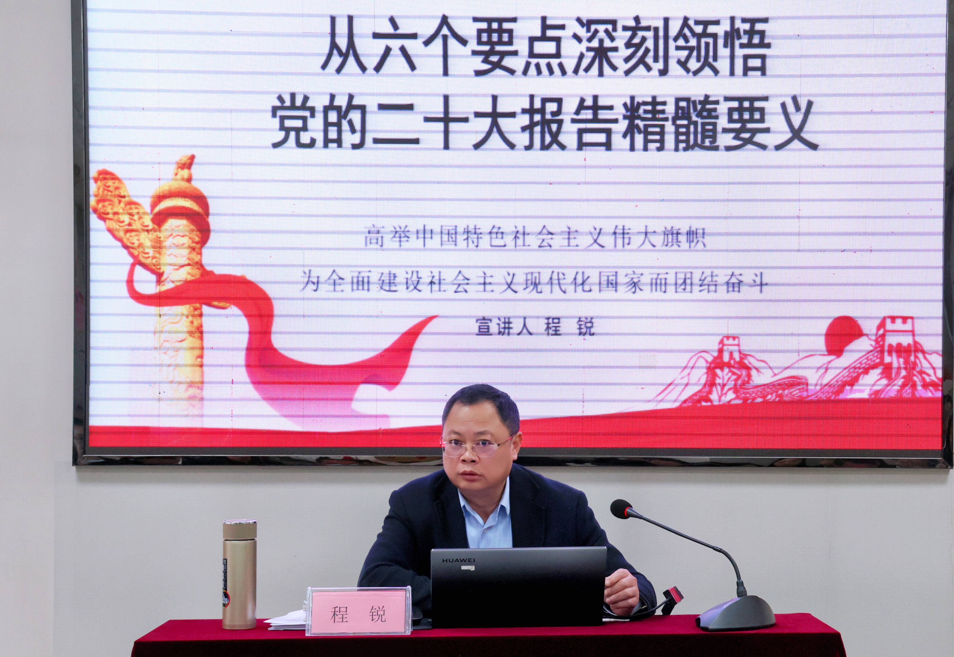 程锐以《从六个要点深刻领悟党的二十大报告精髓要义》为题,对党的二十大精神进行了全面系统深入的宣讲。他从实践成就、理论遵循、使命任务、行动纲领、重要保障、精神品质等6个方面深刻解读了党的二十大报告精髓要义,重点围绕二十大报告关于文化、人才、党建等方面的重要论述,就文交所持续深入学习贯彻党的二十大精神、加快推动企业创新发展等重点工作作了部署和要求。