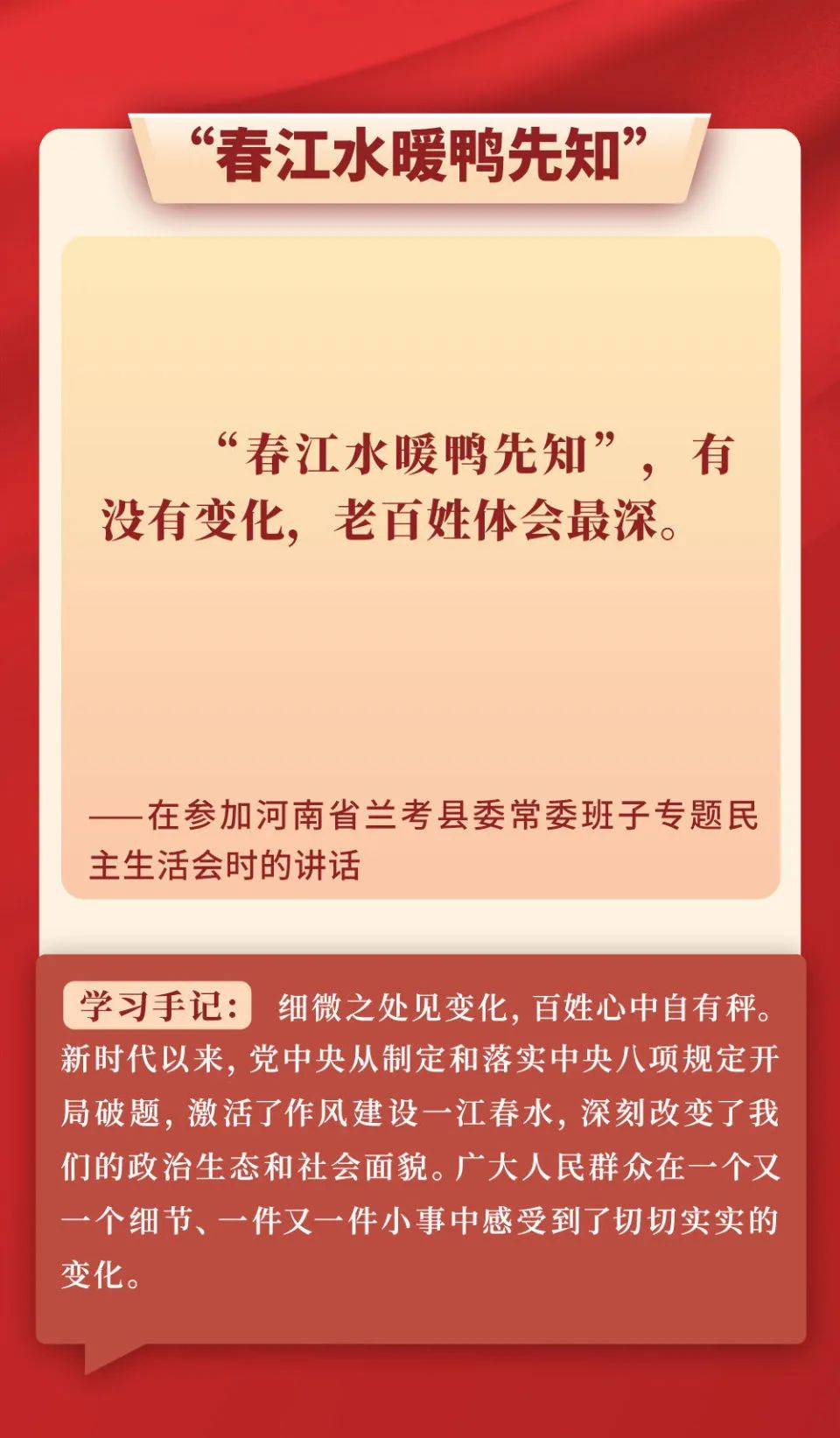 “问渠那得清如许?为有源头活水来。”关于作风建设,习近平总书记常引用各种古语典故,有的从警示层面讲危害,有的从倡导层面谈践行,旁征博引、画龙点睛,把古人智慧化用于作风建设的当代实践,给人以思想启迪、灵魂洗礼。