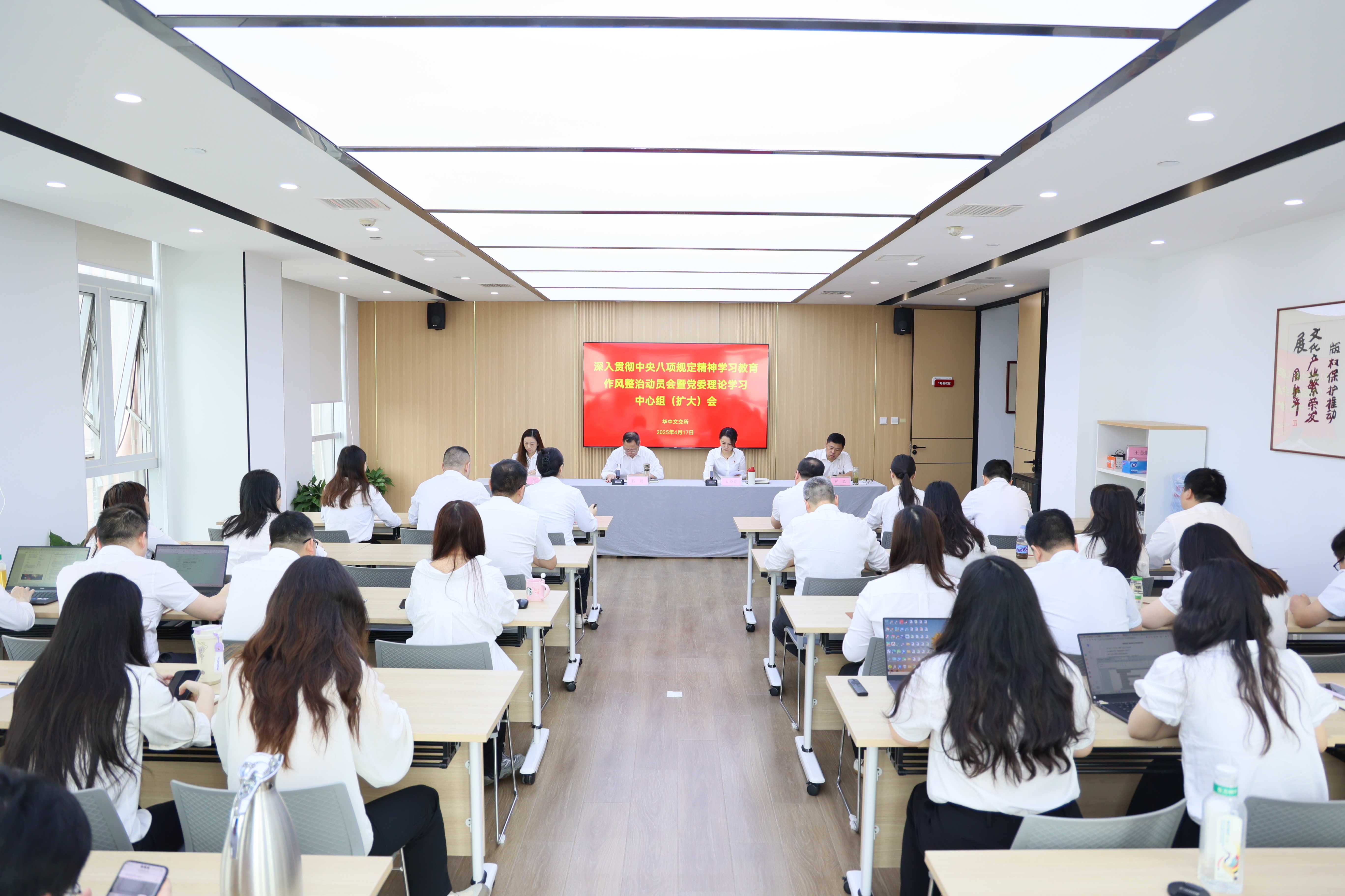 4月17日,华中文交所召开深入贯彻中央八项规定精神学习教育作风整治动员会暨党委理论学习中心组(扩大)会。公司党委书记、董事长程锐主持会议并讲话,全体干部员工参加会议。
