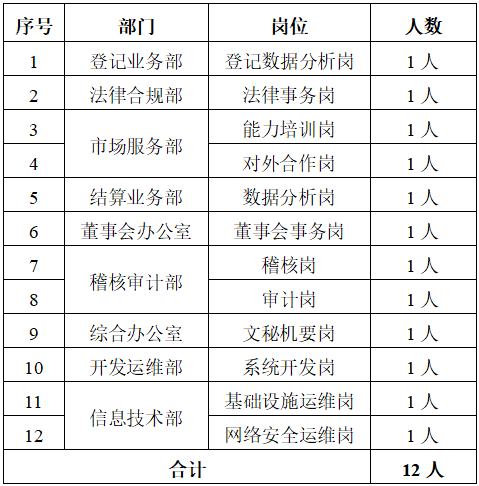本次计划公开招聘市场服务部、登记业务部、结算业务部等9个部门关键岗位人员,拟招聘12人,其中: