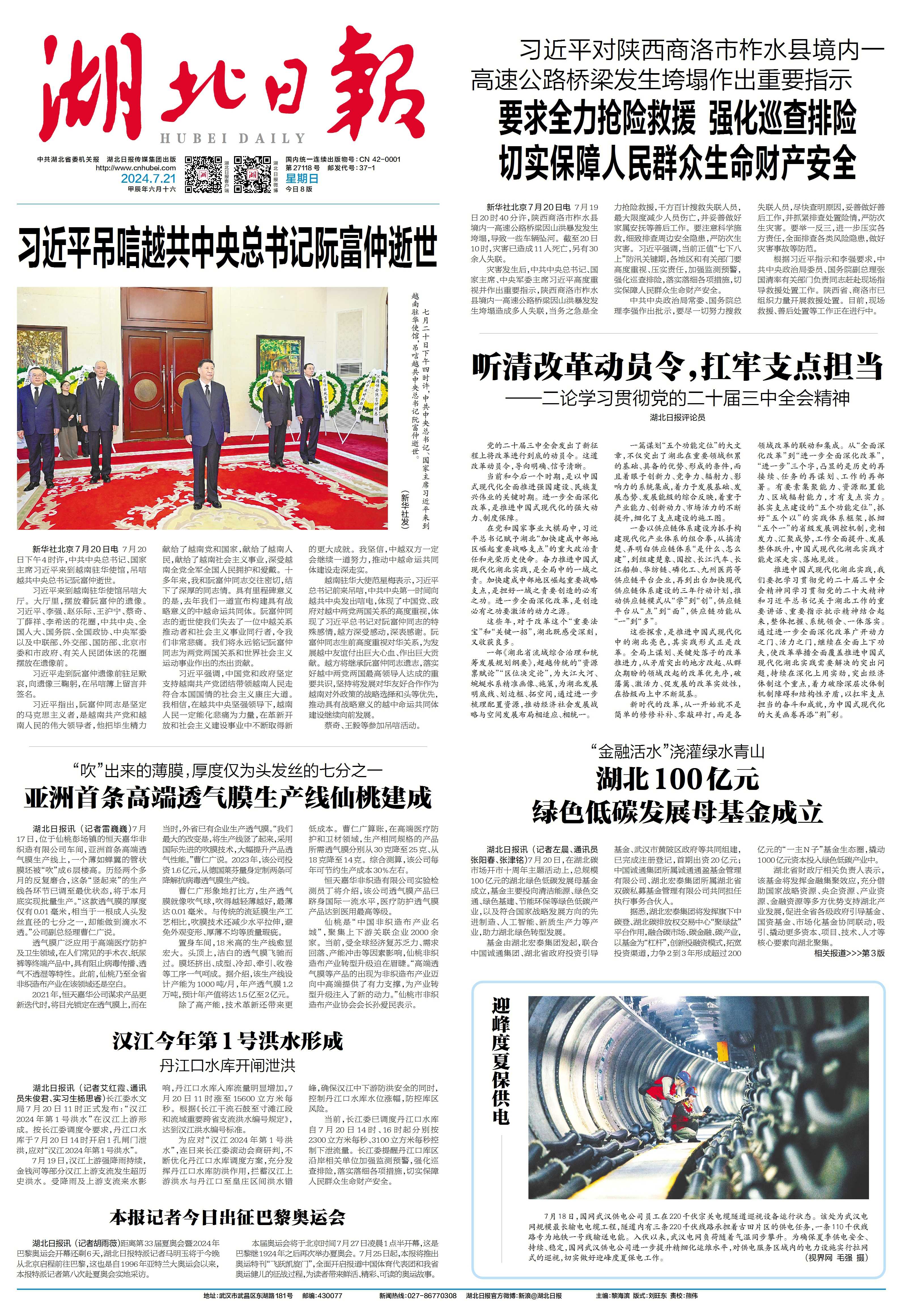 7月20日,在湖北碳市场开市十周年主题活动上,总规模100亿元的湖北绿色低碳发展母基金成立,基金主要投向清洁能源、绿色交通、绿色基建、节能环保等绿色低碳产业,以及符合国家战略发展方向的先进制造、人工智能、新质生产力等产业,助力湖北绿色转型发展。