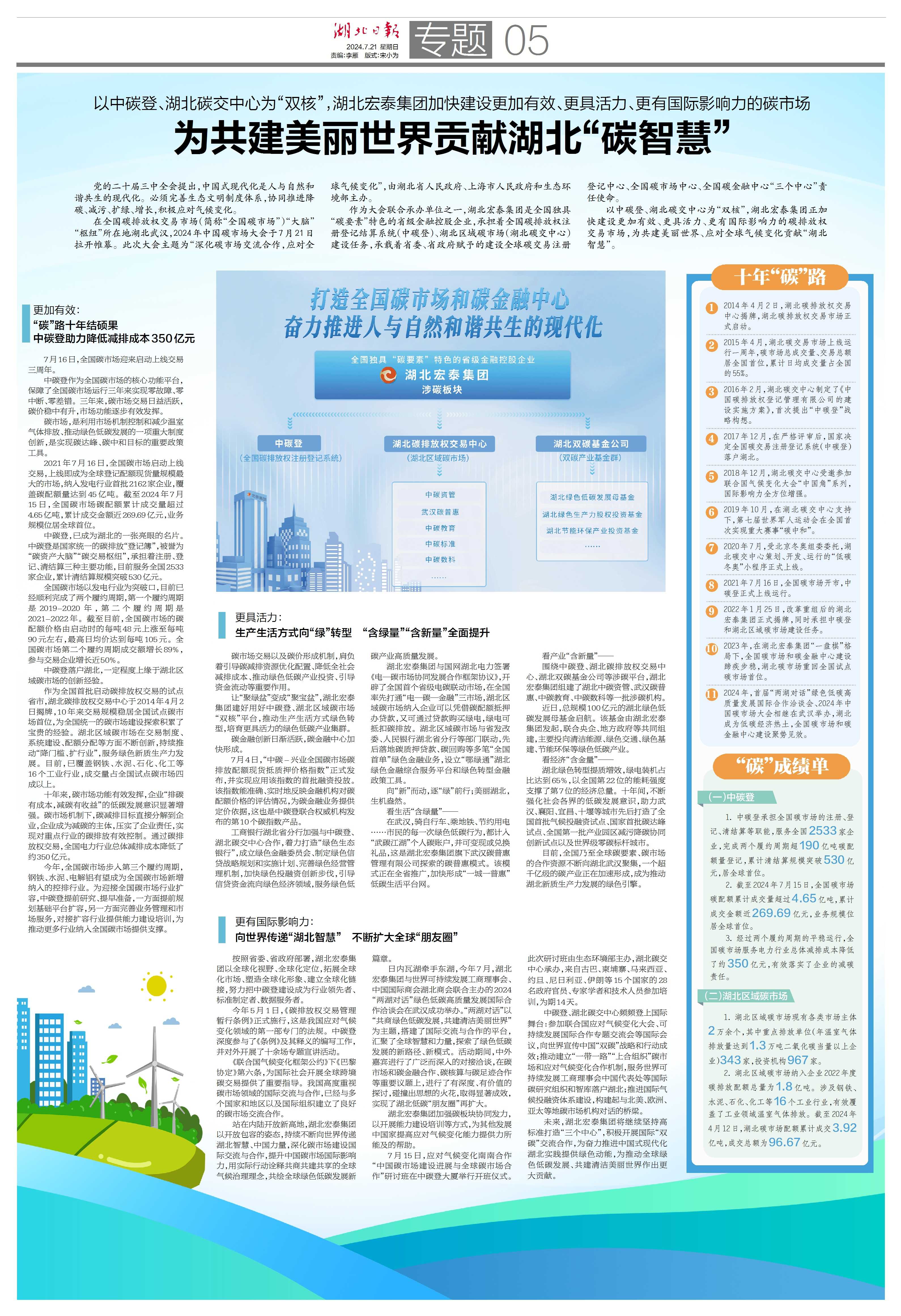 2024年,首届“两湖对话”绿色低碳高质量发展国际合作洽谈会、2024年中国碳市场大会相继在武汉举办,湖北成为低碳经济热土,全国碳市场和碳金融中心建设聚势见效。