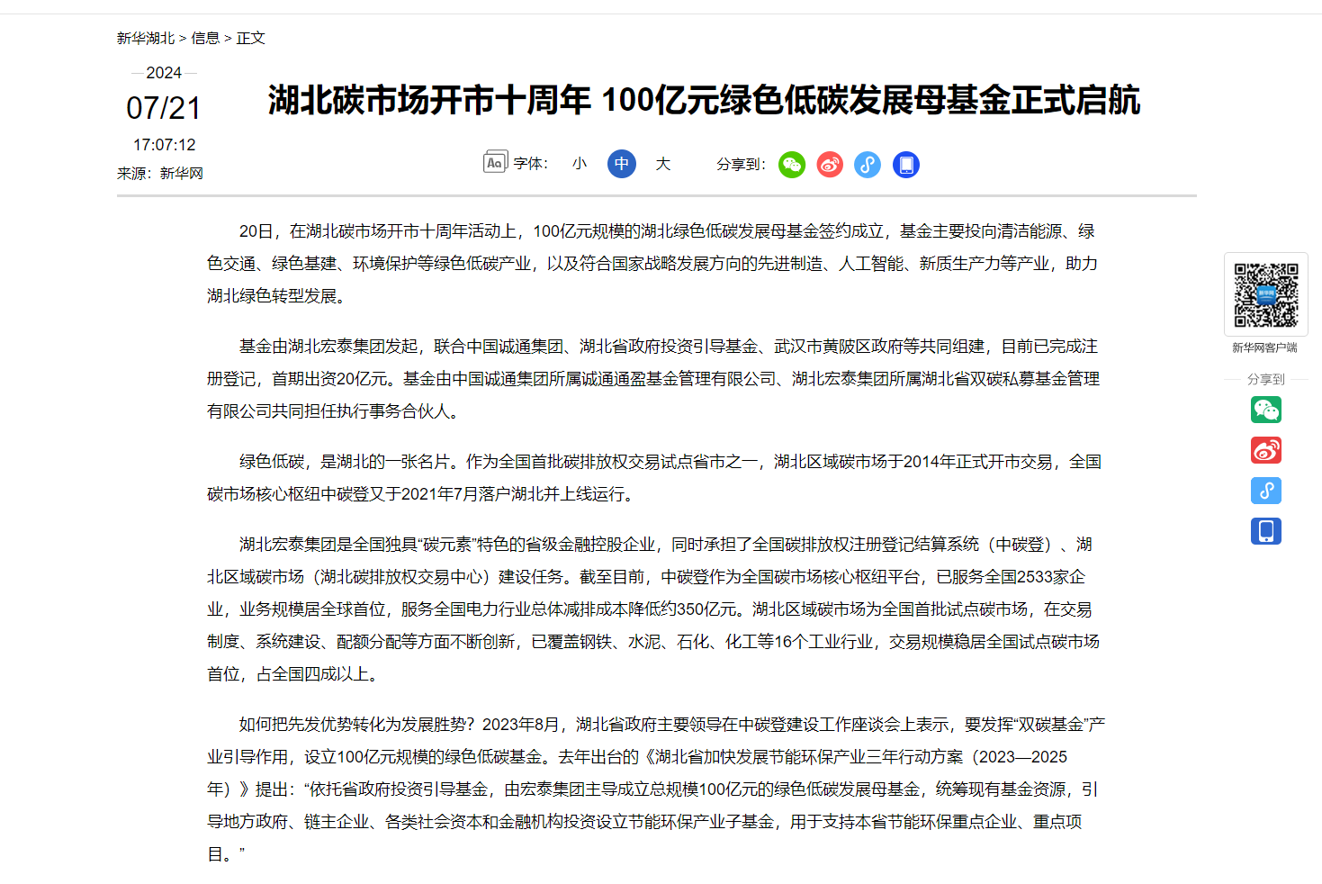 20日,在湖北碳市场开市十周年活动上,100亿元规模的湖北绿色低碳发展母基金签约成立,基金主要投向清洁能源、绿色交通、绿色基建、环境保护等绿色低碳产业,以及符合国家战略发展方向的先进制造、人工智能、新质生产力等产业,助力湖北绿色转型发展。