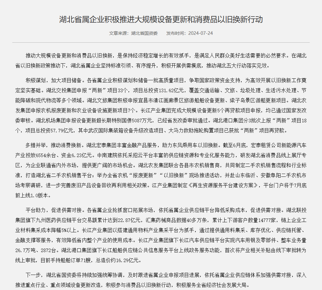 推动大规模设备更新和消费品以旧换新,是保持经济稳定增长的有效抓手,是满足人民群众美好生活需要的必然要求。在湖北省以旧换新政策推动下,湖北省属企业坚持标准引领、有序提升,积极开展供需摸底,推动湖北五大行动落实见效。