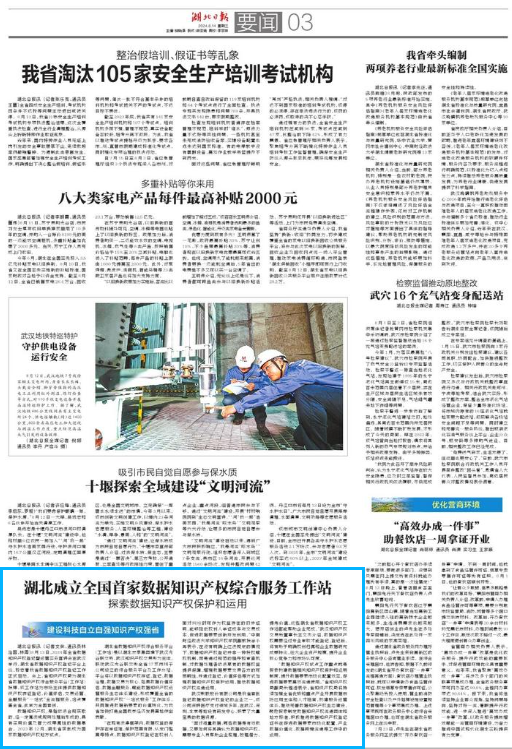 8月13日,2024年全省数据知识产权登记暨运营实务宣讲会在武汉举行,湖北省数据知识产权登记平台上线,标志着我省数据知识产权登记工作正式启动。会上,省知识产权局为湖北省数据知识产权综合服务平台(工作站)授牌,该工作站为市场主体提供数据知识产权存证登记、价值评估、交易运营、金融服务“一站式”全流程服务,站点覆盖全省,此举为全国首创。