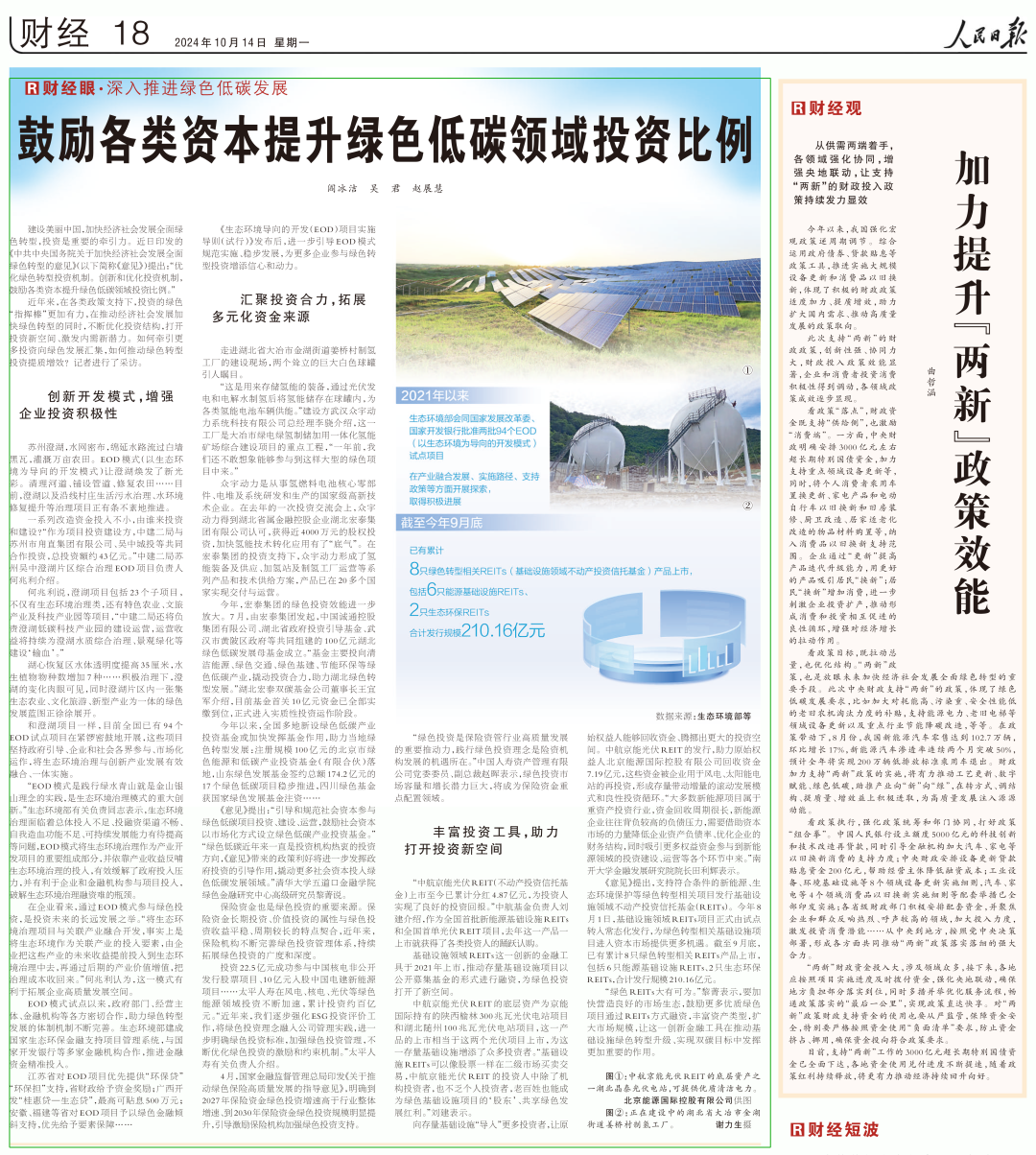 《意见》提出,支持符合条件的新能源、生态环境保护等绿色转型相关项目发行基础设施领域不动产投资信托基金(REITs)。今年8月1日,基础设施领域REITs项目正式由试点转入常态化发行,为绿色转型相关基础设施项目进入资本市场提供更多机遇。截至9月底,已有累计8只绿色转型相关REITs产品上市,包括6只能源基础设施REITs、2只生态环保REITs,合计发行规模210.16亿元。