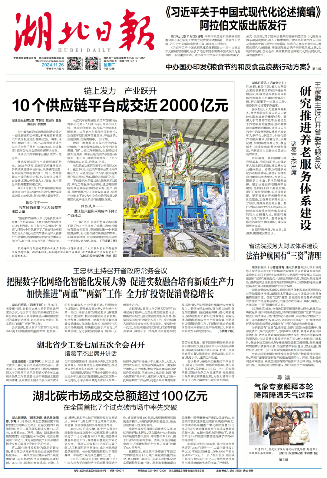11月25日,湖北宏泰集团旗下碳排放权交易中心大屏上,红绿交错的K线图显示:当日二氧化碳配额成交量14.3万吨,交易额596.7万元。至此,湖北碳市场碳配额累计成交量达4.09亿吨、成交总额突破100亿元,成为全国首批7个试点碳市场中交易总额首个突破百亿的市场。