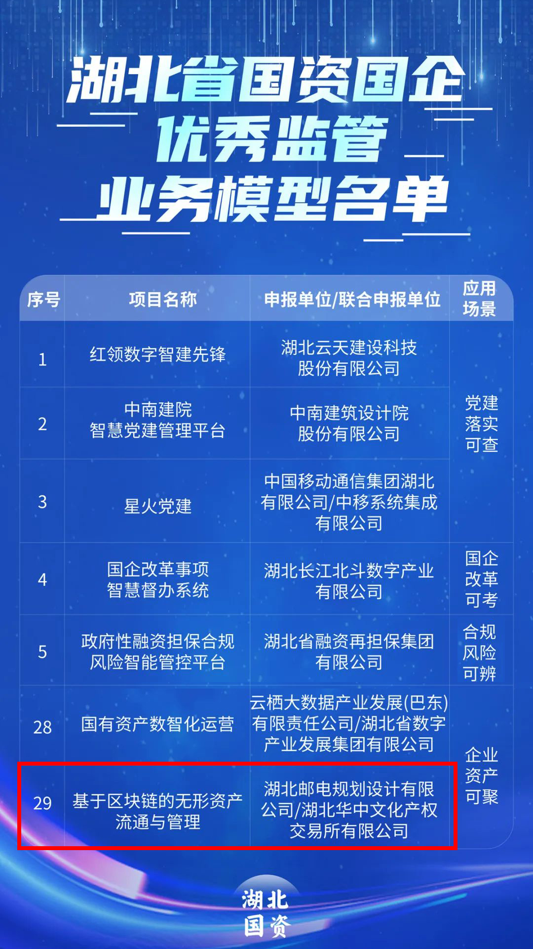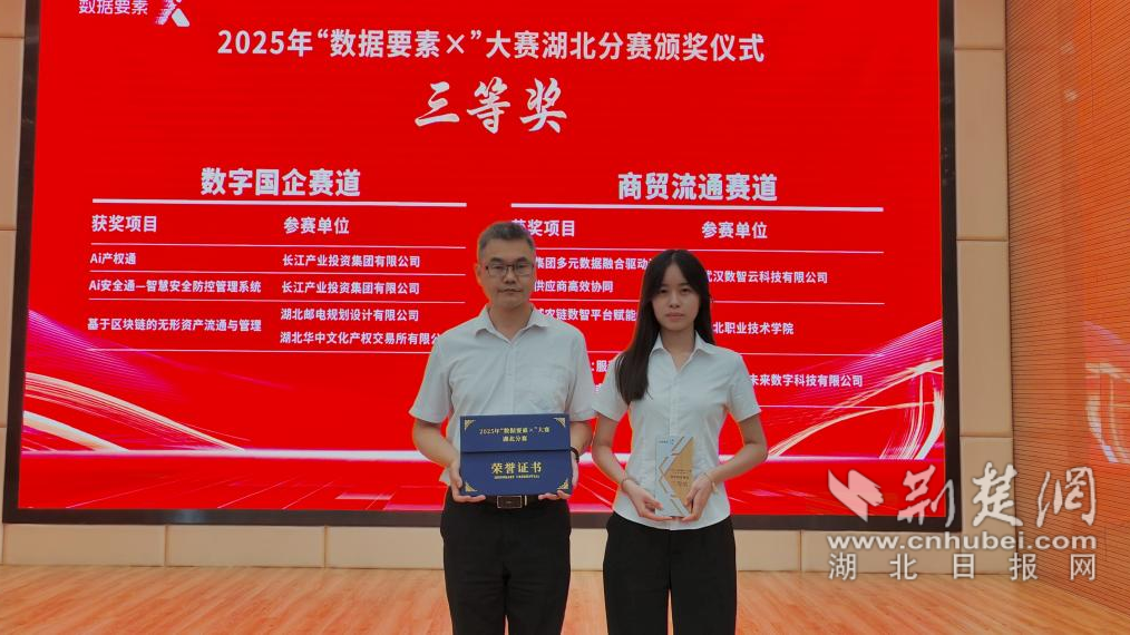 荆楚网(湖北日报网)讯(通讯员 程涛、刘欣然)8月14日,在武汉举办的2025年“数据要素×”大赛湖北分赛决赛落下帷幕,华中文交所与湖北邮电规划设计有限公司联合申报的“基于区块链的无形资产流通与管理”项目,荣膺“数字国企赛道”三等奖。同日,湖北省国资国企智能监管业务模型创新“揭榜挂帅”活动揭晓,经过严格的初筛、初评和终评环节,该项目从29家单位提交的55个参赛模型作品中脱颖而出,最终入选29个“全省国资国企优秀监管业务模型”。