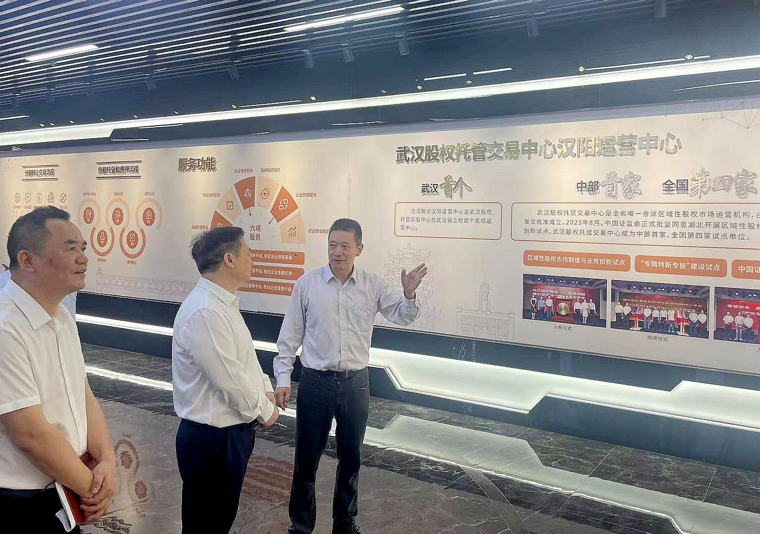 7月19日下午,武汉市副市长汪元程到武汉股交汉阳运营中心调研考察,并参观了汉阳运营中心展示大厅。