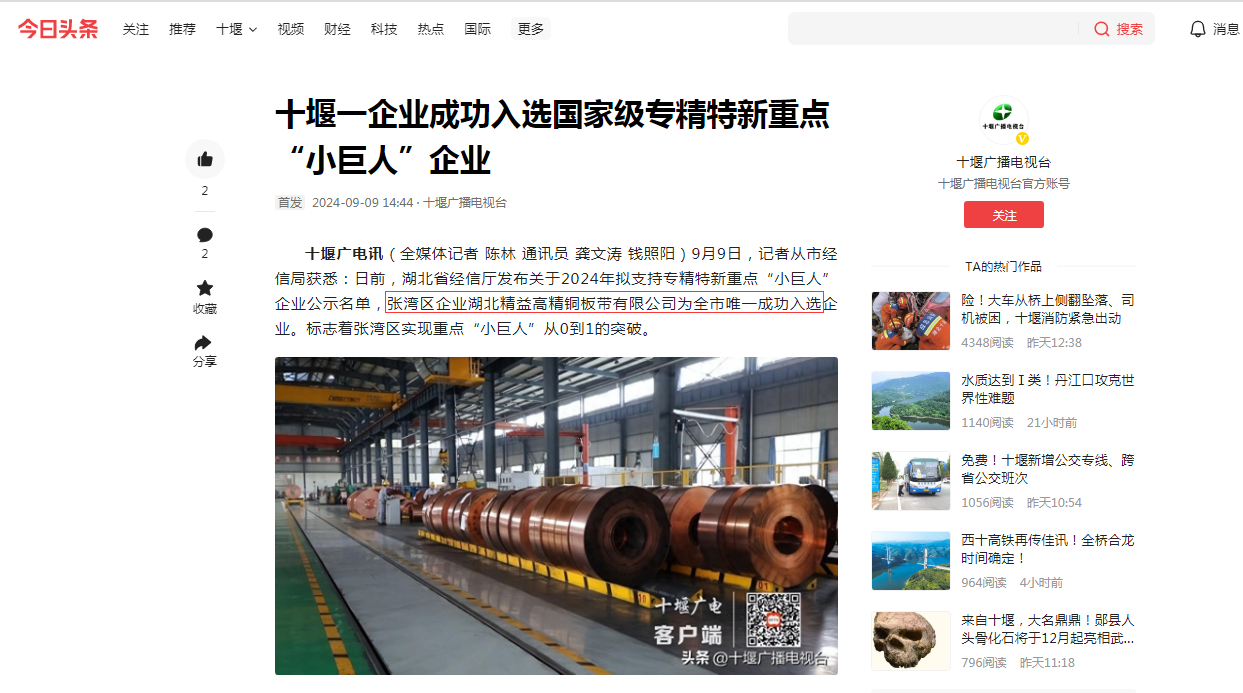 日前,湖北省经信厅发布《关于2024年拟支持专精特新重点“小巨人”企业名单的公示》,湖北精益高精铜板带有限公司作为湖北省绿色金融综合服务平台(以下简称“鄂绿通”)已入库绿色融资企业,成功入选国家级专精特新重点“小巨人”企业,成为十堰市唯一获此殊荣的企业,同时也是张湾区首家获此认定的重点“小巨人”企业。此次入选是对其创新能力、市场竞争力及可持续发展能力的充分肯定,也是对其在推动行业绿色转型升级中作出突出贡献的高度认可。