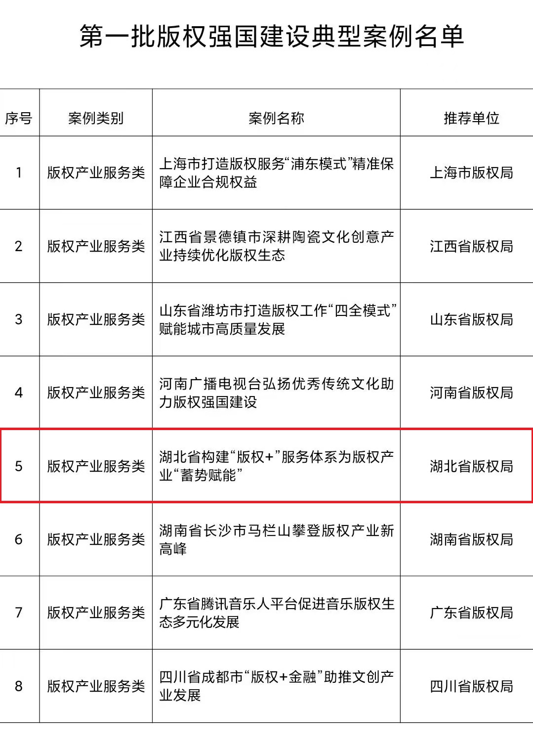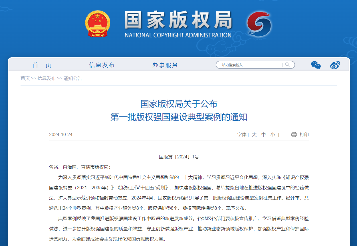 10月24日,国家版权局公布第一批版权强国建设典型案例名单,综合反映了我国推进版权强国建设工作中取得的新进展新成效。经评审,共遴选出24个典型案例,其中版权产业服务类8个、版权保护类8个、版权国际传播类8个。经湖北省版权局推荐,华中文交所《构建“版权+”服务体系,为版权产业“蓄势赋能”》入选“版权产业服务类”典型案例。