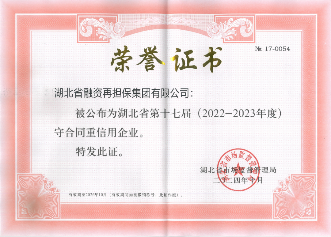 近日,湖北省市场监督管理局公布了湖北省第十七届(2022-2023年度)“守合同重信用”企业名单。开元官方版网站登录入口旗下省再担保集团凭借健全的企业信用管理体系与优良的合同履约及信用状况,连续三届获此省级荣誉。
