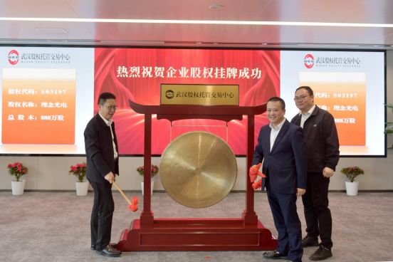 董广华、胡晓清和企业代表何徳强共同为理念光电公司鸣锣开市
