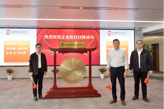 董广华、胡晓清和企业代表杨华共同为唐辰节能公司鸣锣开市