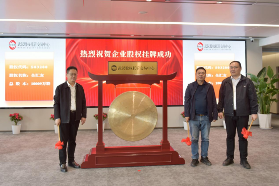 董广华、胡晓清和企业代表张海林共同为全汇友公司鸣锣开市