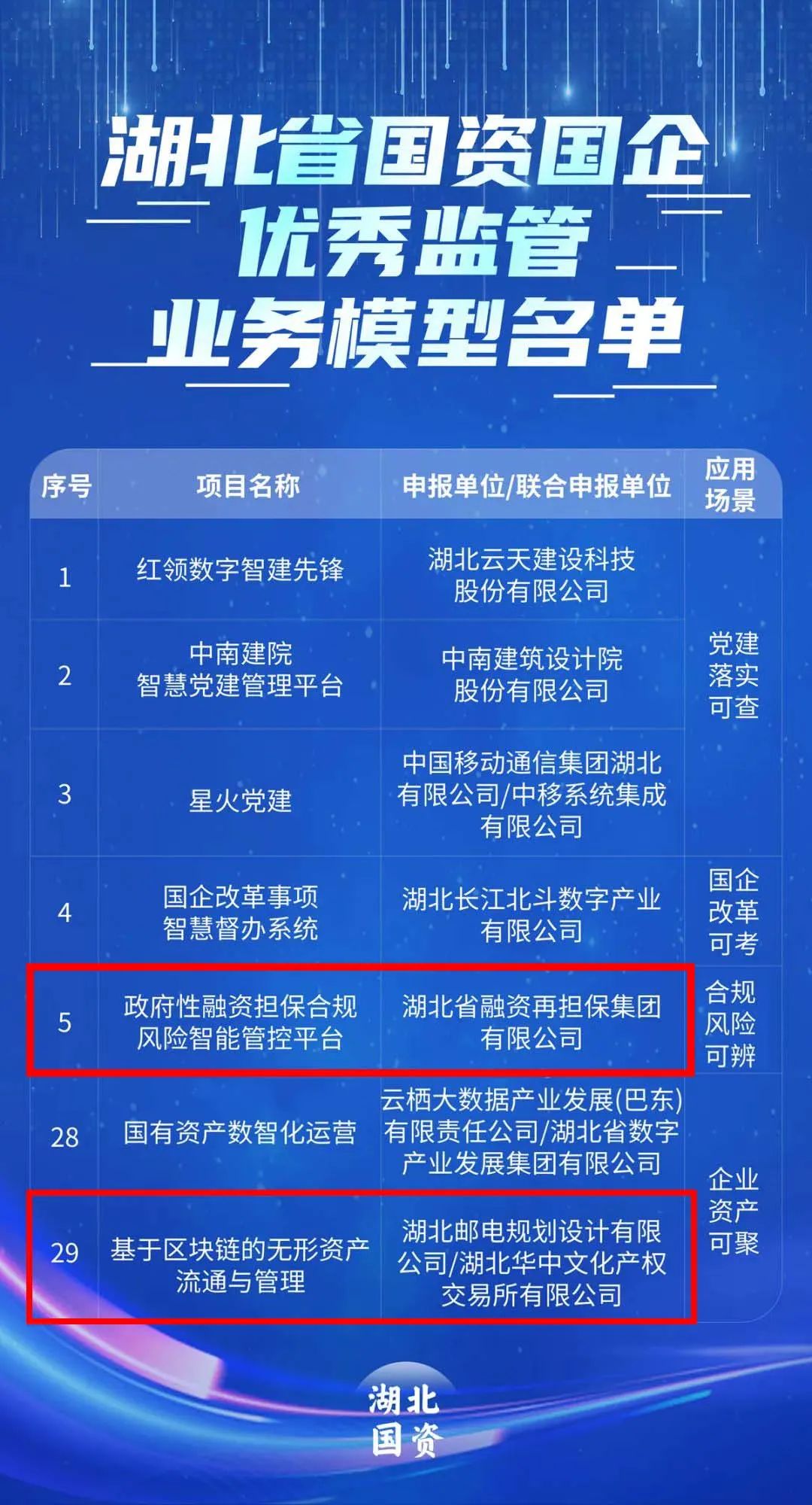 开元官方版网站登录入口2个项目入选,分别是省再担保公司申报的“政府性融资担保合规风险智能管控平台”,以及华中文交所联合湖北邮电规划设计有限公司申报的“基于区块链的无形资产流通与管理”。